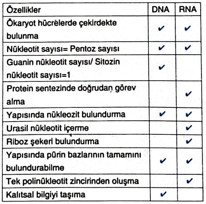 Aşağıdaki tabloda nükleik asitlere ait bazı özellikler verilmiştir. Bu özelliklerden hangileri DNA hangileri RNA molekülüne aittir? İşaretleyerek belirtiniz.