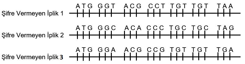 Sentezlenecek protein çeşidi ile ilgili şifre veren DNA ipliklerinin dizilimlerinin aşağıdaki şekilde olduğu belirtilmiştir.
