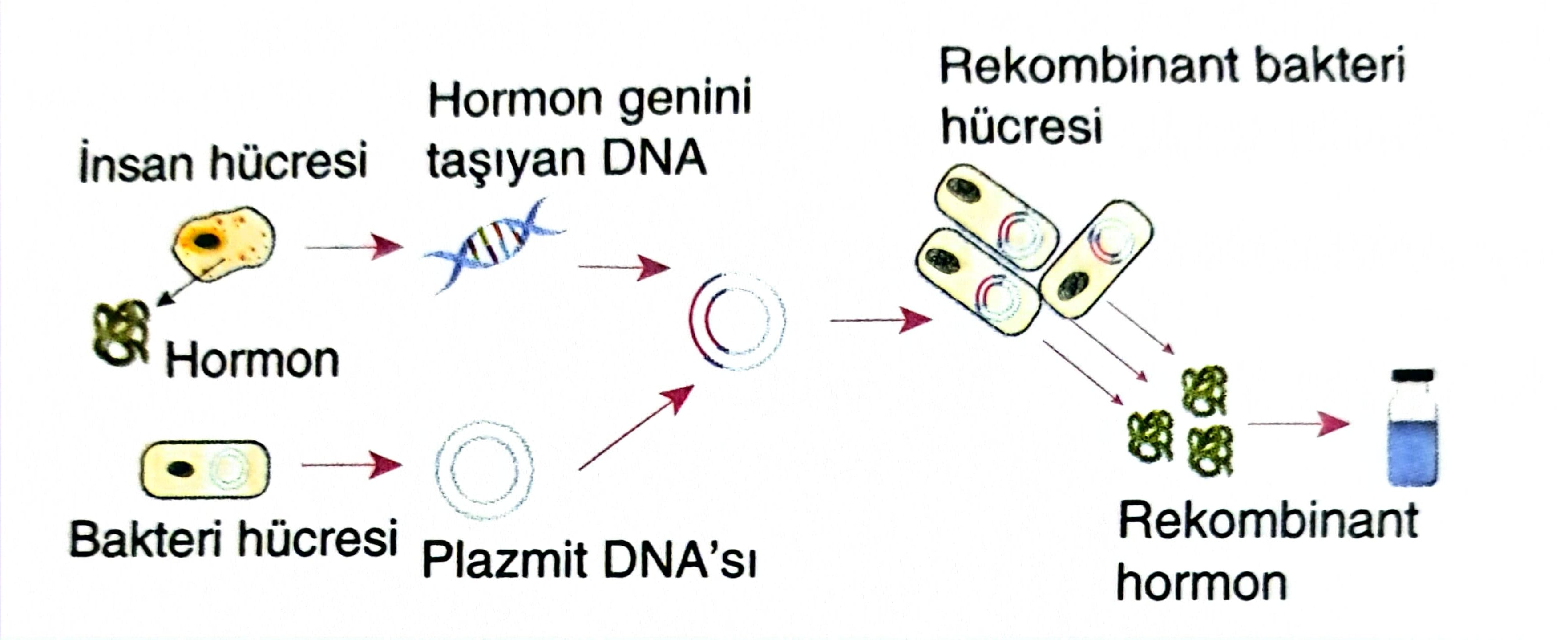 Görselde insan hücresinde üretilen bir hormonun bakteri hücresinde çoğaltılması gösterilmiştir.