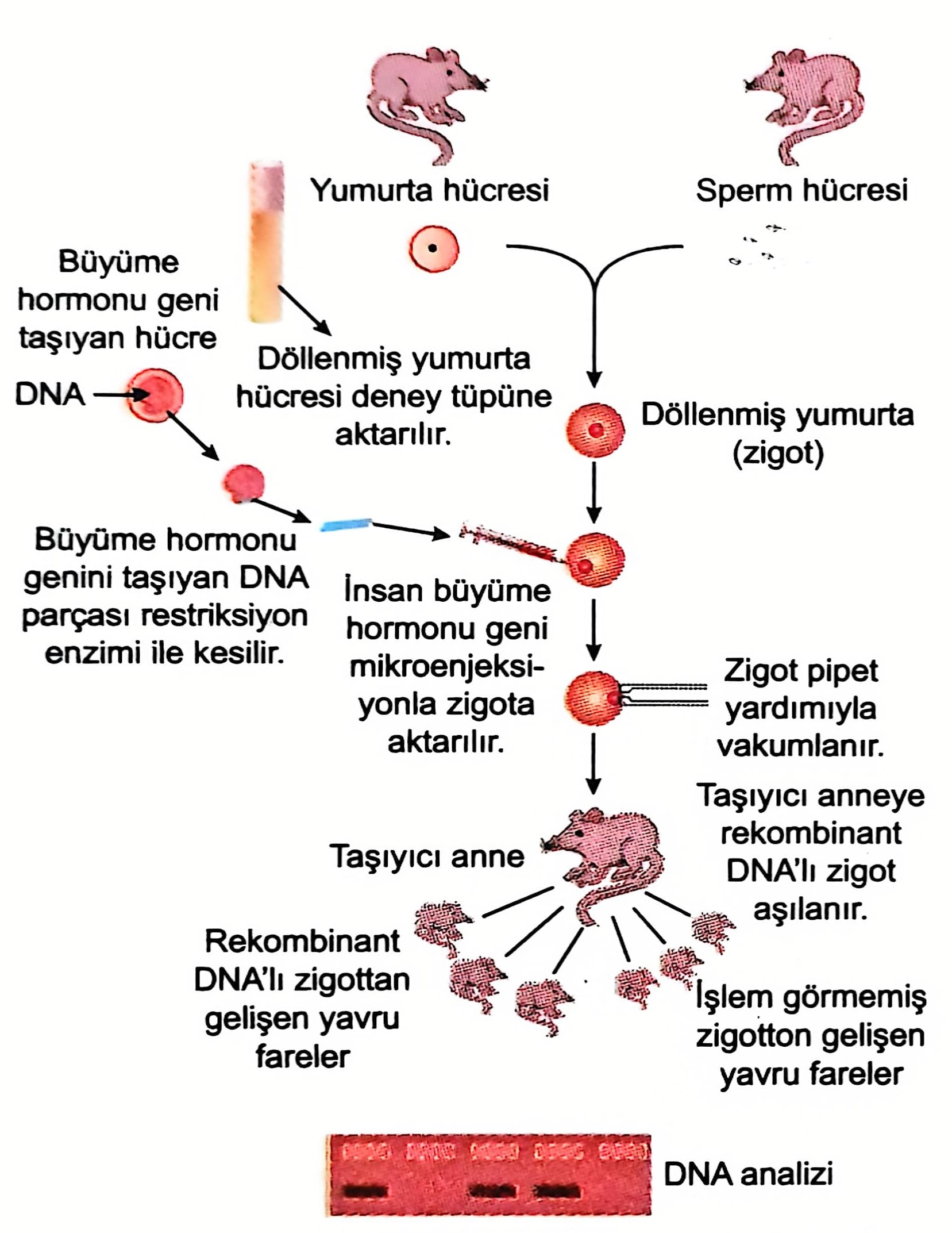 Şekilde farelerde insan büyüme hormonu geninin mikroenjeksiyon yöntemi ile nasıl klonlandığı gösterilmektedir. Öğretmen, transgenik canlıların elde edilmesi sürecinde insana ait bir genin farklı bir türe aktarılabileceğini ve bu genin o türün metabolizmasını etkileyebileceğini belirtmiştir. Ayrıca transgenik canlıların genetik özelliklerini sonraki nesillere aktarabilme yetenekleri üzerine öğrencilerle tartışma başlatmıştır.
