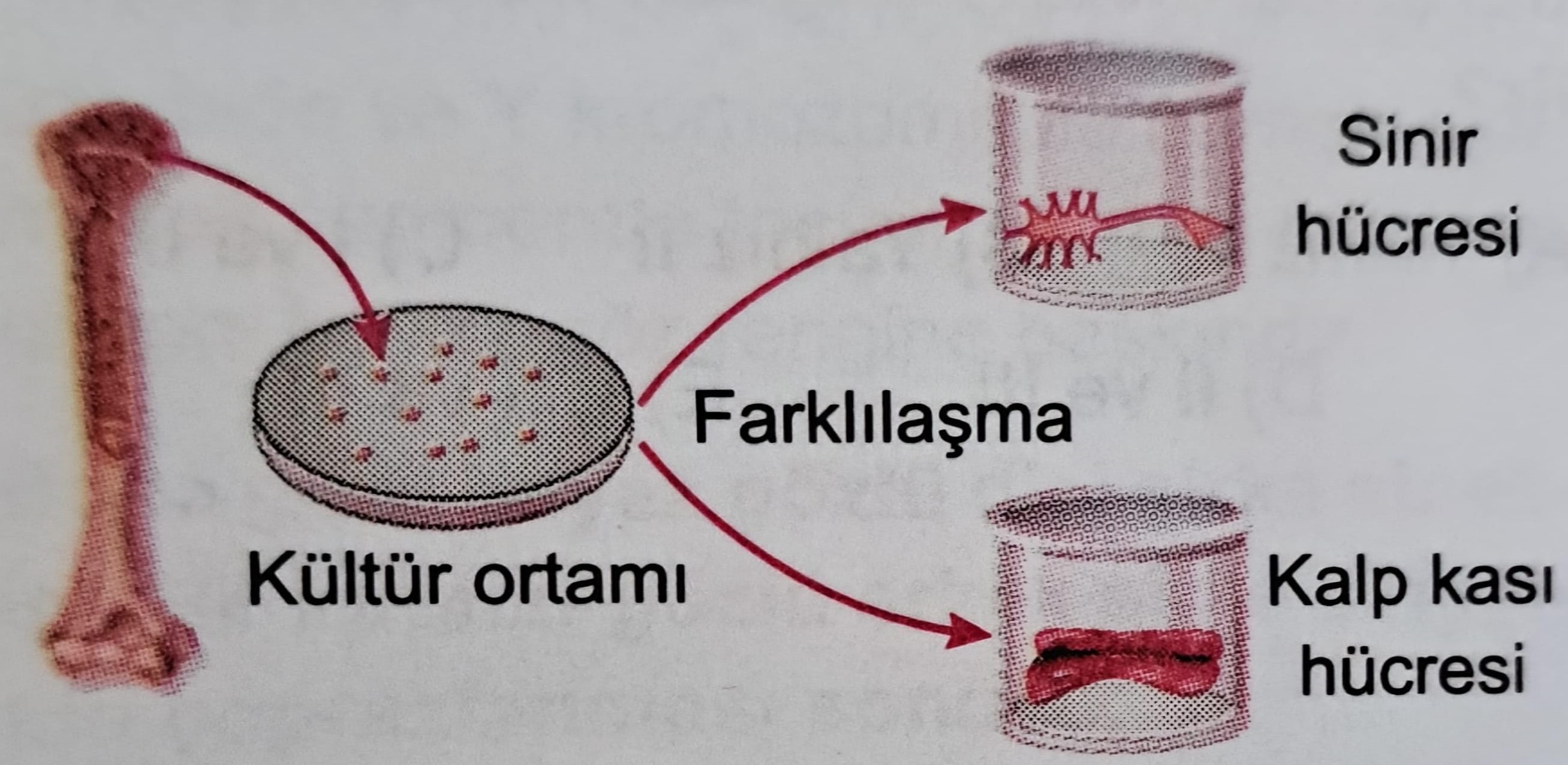 Bir biyoloji dersinde öğretmen kök hücrelerin farklılaşma sürecini ve potansiyel kullanım alanlarını anlatmaktadır. Öğretmen, kemik iliğinden alınan kök hücrelerin kültür ortamında farklı hücre tiplerine (sinir hücresi ve kalp kası hücresi gibi) dönüşebileceğini gösteren bir şekil sunar.