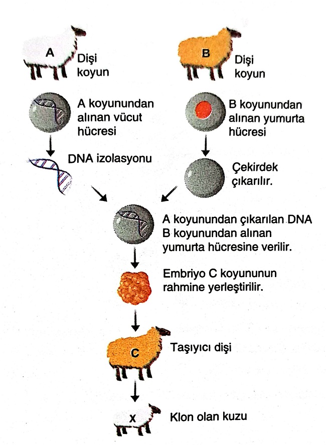 Aşağıdaki şekilde üç farklı koyun kullanılarak gerçekleştirilen klonlama işlemi gösterilmiştir. Buna göre verilen soruları yanıtlayınız.