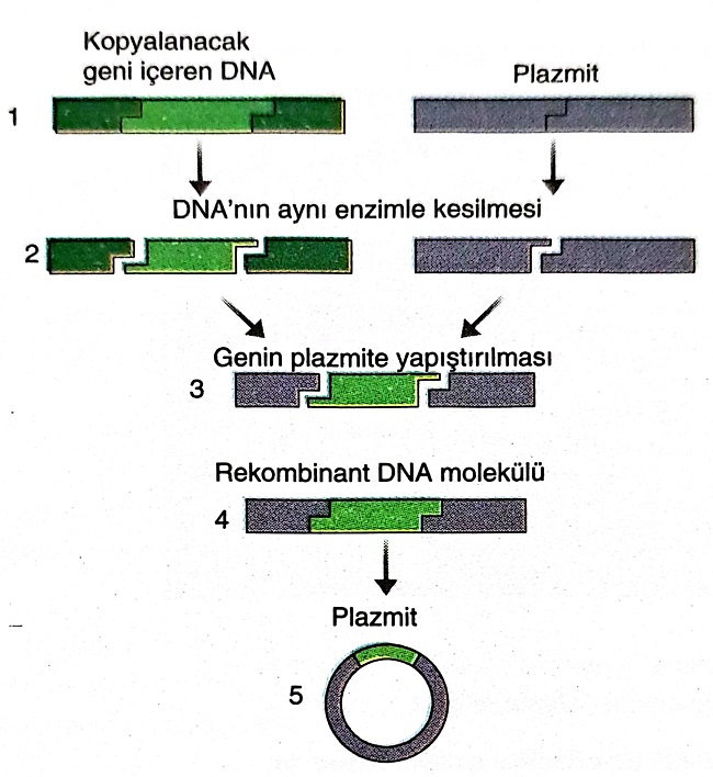 Aşağıdaki şekilde rekombinant DNA teknolojisi kullanılarak rekombinant DNA elde edilmesi sırasında gerçekleşen bazı olaylar numaralandırılmış olarak gösterilmiştir. Gen klonlama süreci ile ilgili verilen soruları yanıtlayınız.