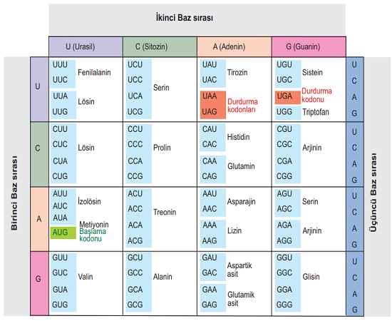 Aşağıdaki tabloda amino asitlere karşılık gelen kodonlar verilmiştir.