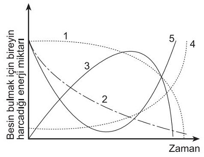 Yukarıdaki grafikte numaralanmış eğrilerden hangisi, besin kaynakları sınırlı olan bir gölde bulunan ve yoğunluğu giderek artan bir balık popülasyonunda besin bulmak için bir bireyin harcadığı enerji miktarındaki değişimi göstermektedir?