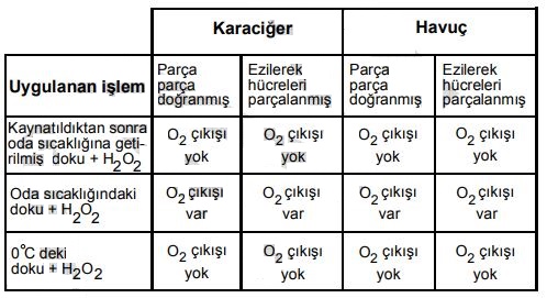 Bu olayla ilgili bir deneyde, karaciğer ve havuçtan alınan doku örneklerine aşağıdaki tabloda verilen işlemler uygulandıktan sonra bu örnekler, içinde eşit miktarda H2O2 bulunan 12 özdeş tüpe ayrı ayrı konulmuş ve tabloda belirtilen sıcaklıklarda tutulmuştur. Belirli bir süre boyunca tüplerdeki oksijen çıkışı gözlenmiş ve tabloda belirtilen bulgular elde edilmiştir