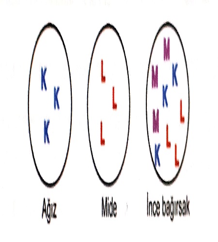 Aşağıdaki şekilde, insanın sindirim organlarında kimyasal sindirime uğrayan bazı maddeler K, L, M harfleriyle simgelenmiştir.
