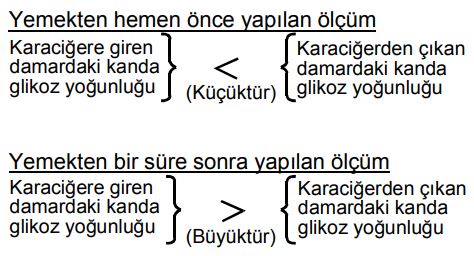 Bir araştırmacı, insanda, karaciğere giren ve çıkan damarlardaki kanda glikoz yoğunluğunu yemekten hemen önce ve bol karbonhidratlı yemekten bir süre sonra ölçmüş ve aşağıdaki bulguları saptamıştır