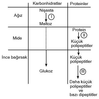 Yukarıdaki tabloda insanda karbonhidrat ve protein sindiriminin bazı aşamaları verilmiştir.