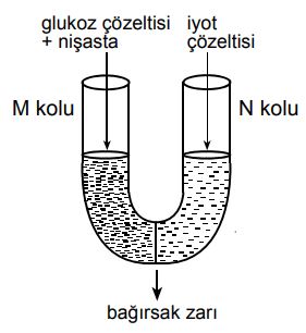 U şeklindeki bir borunun M ve N kolları bir bağırsak zarıyla şekildeki gibi ayrılmıştır. M koluna glukoz çözeltisiyle nişasta, N koluna ise iyot çözeltisi konmuştur. (İyot nişasta ayıracıdır ve nişasta taneciklerini maviye boyar.)