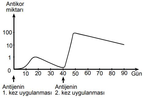 Bir bireye belirli bir hastalığa karşı direnç kazandırmak için iki ayrı zamanda aşı yapılarak bu hastalıkla ilgili antijen verilmiştir. Aşağıdaki grafik, bu bireyin kanında bulunan antikor miktarının, antijenin 1. ve 2. kez uygulanmasına bağlı olarak değişimini göstermektedir.