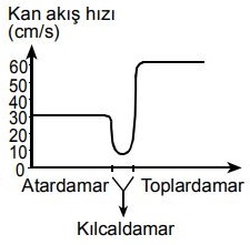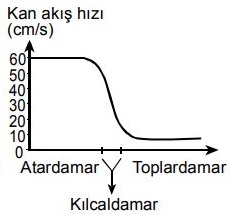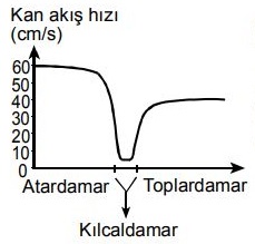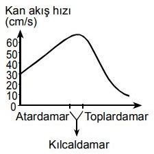 Bir insanda, atardamar, kılcaldamar ve toplardamardan geçmekte olan kanın normal akış hızını gösteren grafik aşağıdakilerden hangisidir?