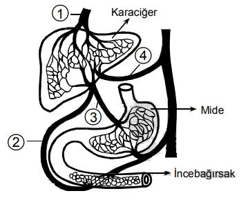 İnsanda, karaciğerin bazı besin maddelerinin depolanması, kanın zehirli maddelerden arındırılması, homeostasisin sağlanması gibi görevleri vardır. Aşağıdaki şemada, karaciğere kan getiren ve karaciğer- den kan götüren damarlar numaralanarak gösterilmiştir.