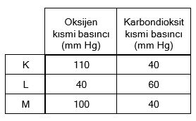 Buna göre, K, L ve M ile gösterilen alveol, aort kanı ve doku sıvısı aşağıdakilerin hangisinde doğru olarak verilmiştir?