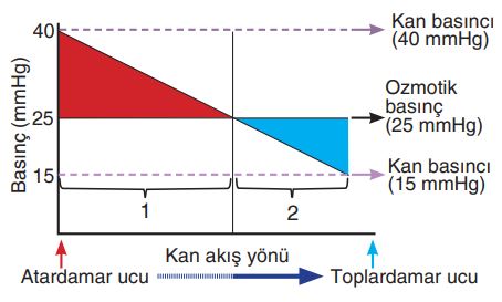Sağlıklı bir insanda kılcal damarlarla doku sıvısı arasında gerçekleşen madde alışverişinde etkili olan kan basıncı ve ozmotik basınç grafiği aşağıda verilmiştir.