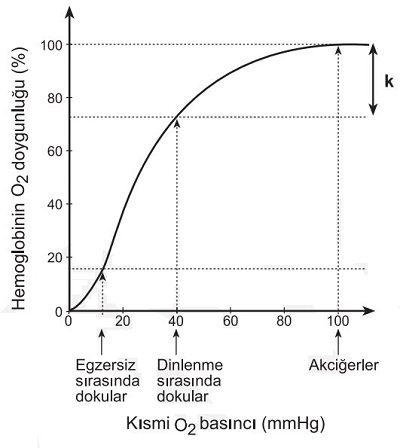 Buna göre eğride, dinlenme sırasında dokulardaki hemoglobinin oksijen doygunluğu ile akciğerlerdeki hemoglobinin oksijen doygunluğu arasında k ile gösterilen bir fark vardır.