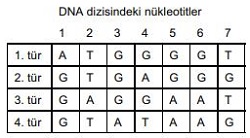 Aşağıdaki tabloda, yakın akraba olan dört kuş türüne ait DNA'ların 7 nükleotitlik baz dizileri verilmiştir.