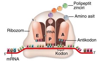 Ribozomda gerçekleşen bir polipeptit sentezi aşağıda şematize edilmiştir. UAA, UAG ve UGA kodonlarının durdurma kodonları olduğu bilinmektedir.