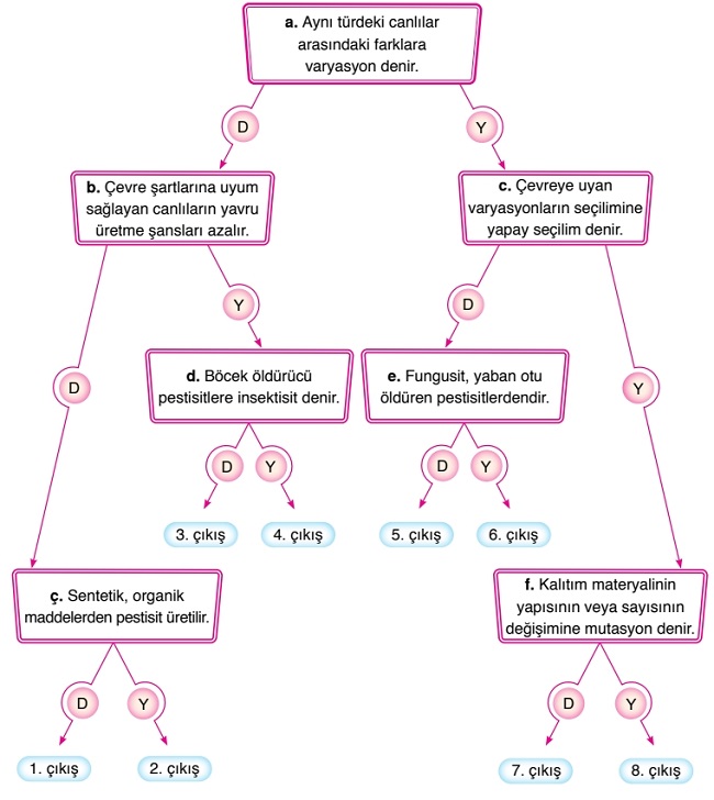 Aşağıda birbiri ile bağlantılı doğru (D) ya da yanlış (Y) ifadeler içeren tanılayıcı dallanmış ağaç tekniğinde bir soru verilmiştir. “a”dan başlayıp cümlelerin doğru ya da yanlış olduğuna karar vererek ilgili ok yönünde ilerleyiniz. Her cevap bir sonraki aşamayı etkileyecektir. Vereceğiniz cevaplarla doğru çıkışı bulunuz.
