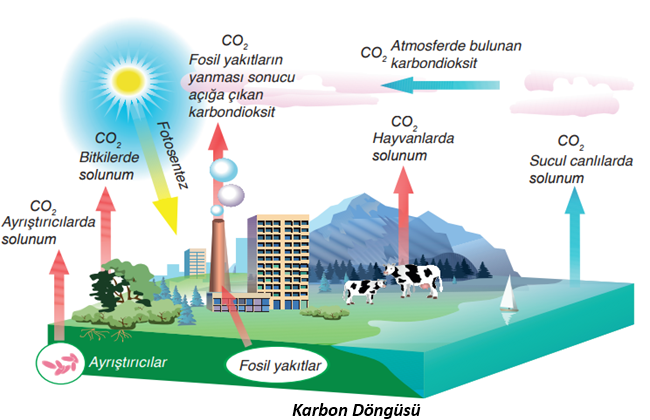 ► Solunum: Bitki ve hayvanlar organik maddeyi kullanır → CO₂ atmosfere geri verilir.