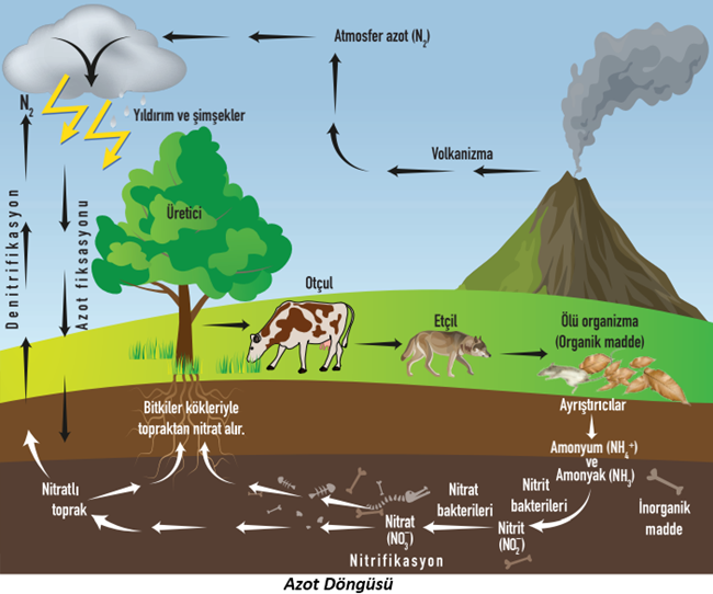 Azot fiksasyonu (bağlanma): Toprakta ve baklagillerin kök nodüllerindeki azot bağlayıcı bakteriler N₂’yi bağlar. Yıldırım/şimşek gibi yüksek enerjili olaylarla da azot toprağa geçebilir.