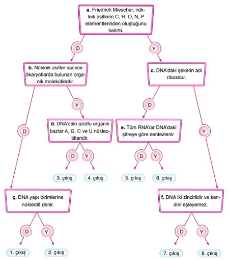 A. Aşağıda birbiri ile bağlantılı doğru (D) ya da yanlış (Y) ifadeler içeren tanılayıcı dallanmış ağaç tekniğinde bir soru verilmiştir. “a”dan başlayıp cümlelerin doğru ya da yanlış olduğuna karar vererek ilgili ok yönünde ilerleyiniz. Her bir cevap, bir sonraki aşamayı etkileyecektir. Vereceğiniz cevaplarla doğru çıkışı bulunuz.