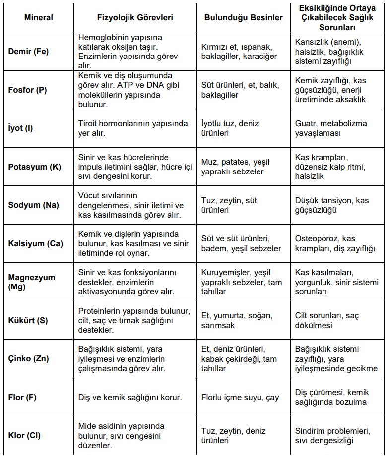 1136Aşağıda bazı mineraller, işlevleri ve eksikliklerinde ortaya çıkabilecek sağlık sorunları ile ilgili bir tablo verilmiştir.